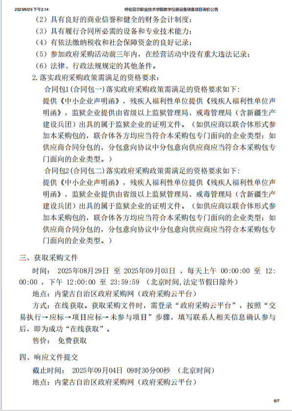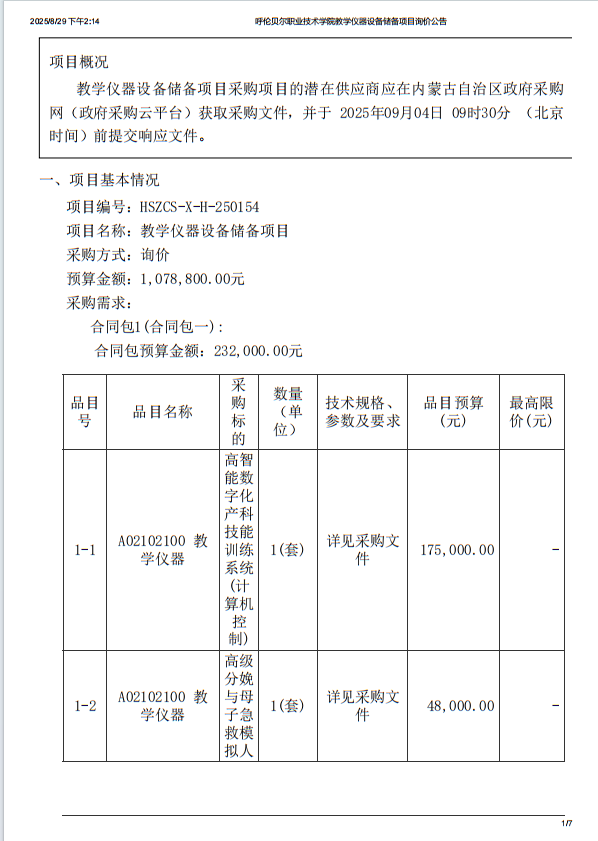 呼伦贝尔职业技术学院教学仪器设备储备项目询价公告