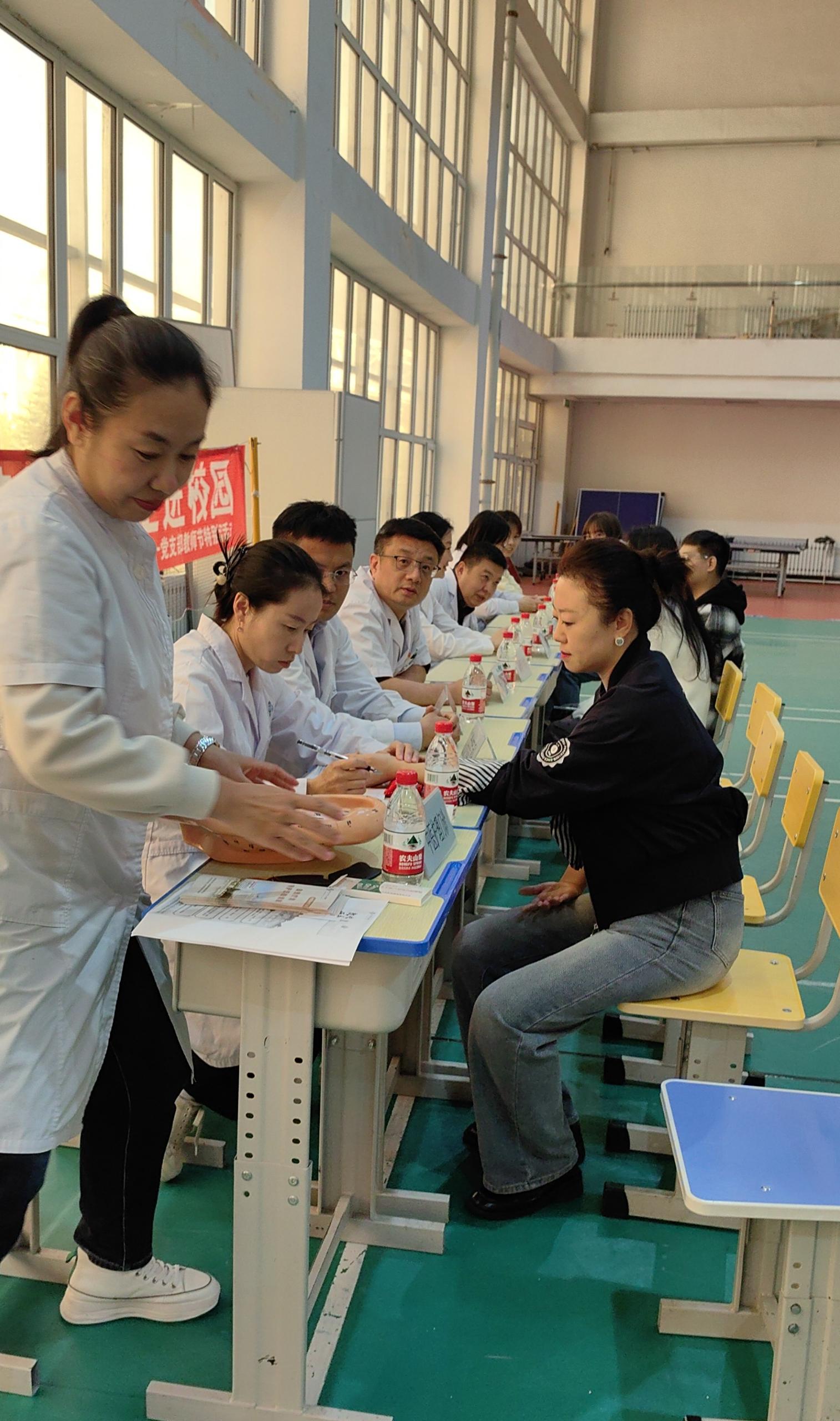 义诊活动现场,气氛温馨而热烈。医生们耐心细致地为每一位前来咨询的教师进行检查和指导:骨科、中医科医生通过触诊、体态评估,为受颈椎腰椎问题困扰的教师制定个性化康复方案,现场演示办公间隙可操作的拉伸动作;中(蒙)医医师为教师们搭脉问诊,根据体质开具调理药方,同时用艾灸等疗法缓解疲劳;变态反应科医生则针对教师群体中常见的粉尘过敏、粉笔灰刺激等问题,开展过敏原筛查,并科普日常防护技巧;乳腺科为女教师开展手诊。